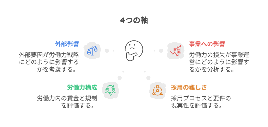 4つの軸と三つの視点で整理することで、人手不足の“リスク構造”が見えてきます。