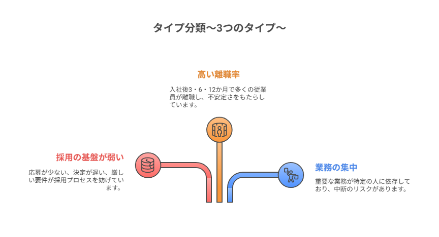 -Bタイプ:人が続かない(入社後3・6・12か月で離職が多い)