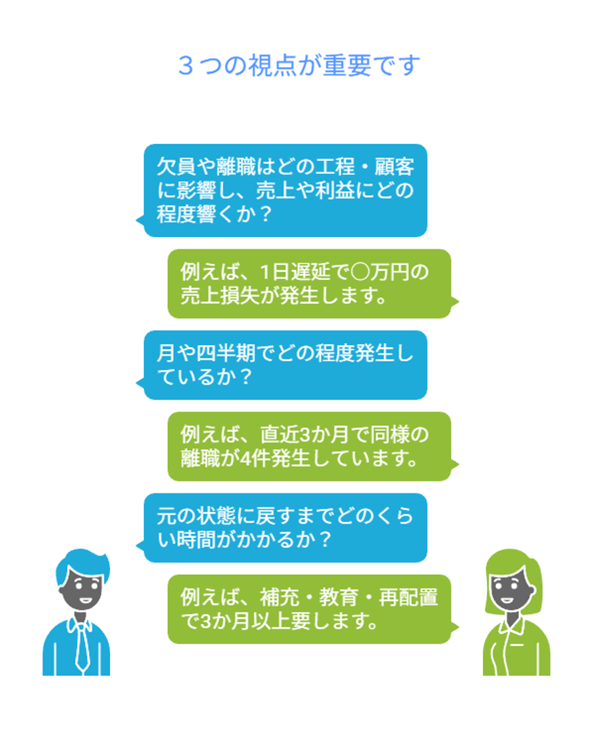 視点A:影響度 — 欠員や離職がどの工程・顧客に影響し、売上や利益にどの程度響くか。