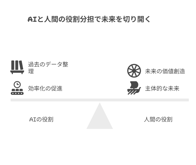 AIがデータを読む時代に、人が担うのは「問いを描く」役割です。データは素材であり、それをどのように料理するかは人の構想力にかかっています。AIは過去を整理しますが、未来を描くのは人。私はこの構造こそ、AI時代の“思考の分業”だと考えています。
