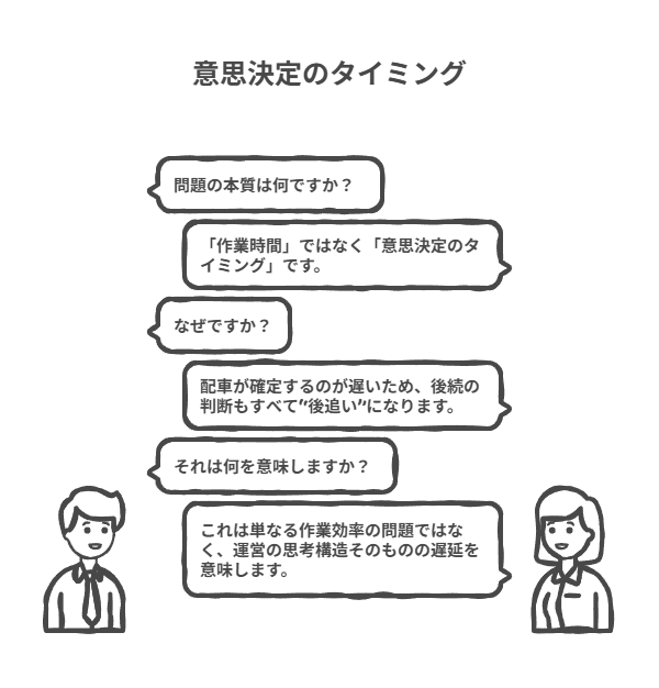 配車が確定するのが遅いため、後続の判断もすべて“後追い”になる。これは単なる作業効率の問題ではなく、運営の思考構造そのものの遅延を意味していた。